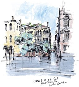 グランドカナルに面して庭木のある邸宅の風景。墨の筆ならではの強弱を表現した作品